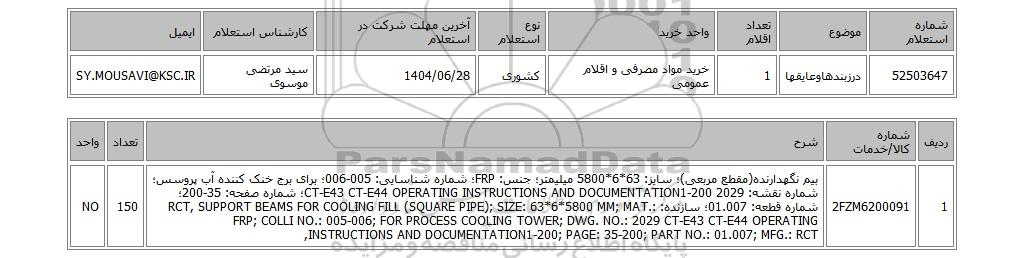 | 52503647 | درزبندهاوعایقها | 1 | خرید مواد مصرفی و اقلام عمومی | کشوری | 1404/06/28 | سید مرتضی موسوی | SY.MOUSAVI@KSC.IR |