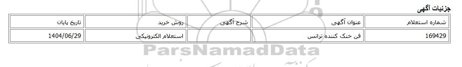 | 169429 | فن خنک کننده ترانس | استعلام الکترونیکی | 1404/06/29 |