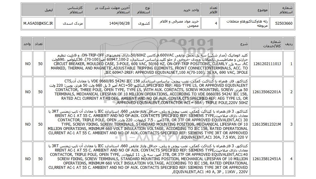 | 52503660 | رله هاوکنتاکتورهاو متعلقات مربوطه | 4 | خرید مواد مصرفی و اقلام عمومی | کشوری | 1404/06/28 | مزدک اسدی | M.ASADI@KSC.IR |