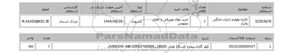 | 52503678 | اثاثیه ولوازم اداری،خانگی وانبار | 1 | خرید مواد مصرفی و اقلام عمومی | کشوری | 1404/06/29 | مزدک اسدی | M.ASADI@KSC.IR |