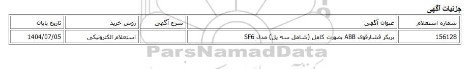 | 156128 | بریکر فشارقوی ABB بصورت کامل (شامل سه پل) مدل SF6 | استعلام الکترونیکی | 1404/07/05 |