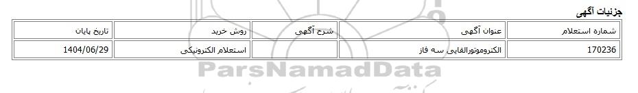 | 170236 | الکتروموتورالقایی سه فاز | استعلام الکترونیکی | 1404/06/29 |