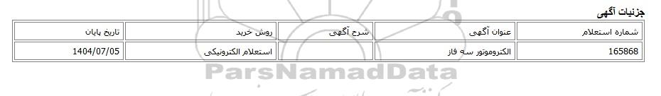 | 165868 | الکتروموتور سه فاز | استعلام الکترونیکی | 1404/07/05 |