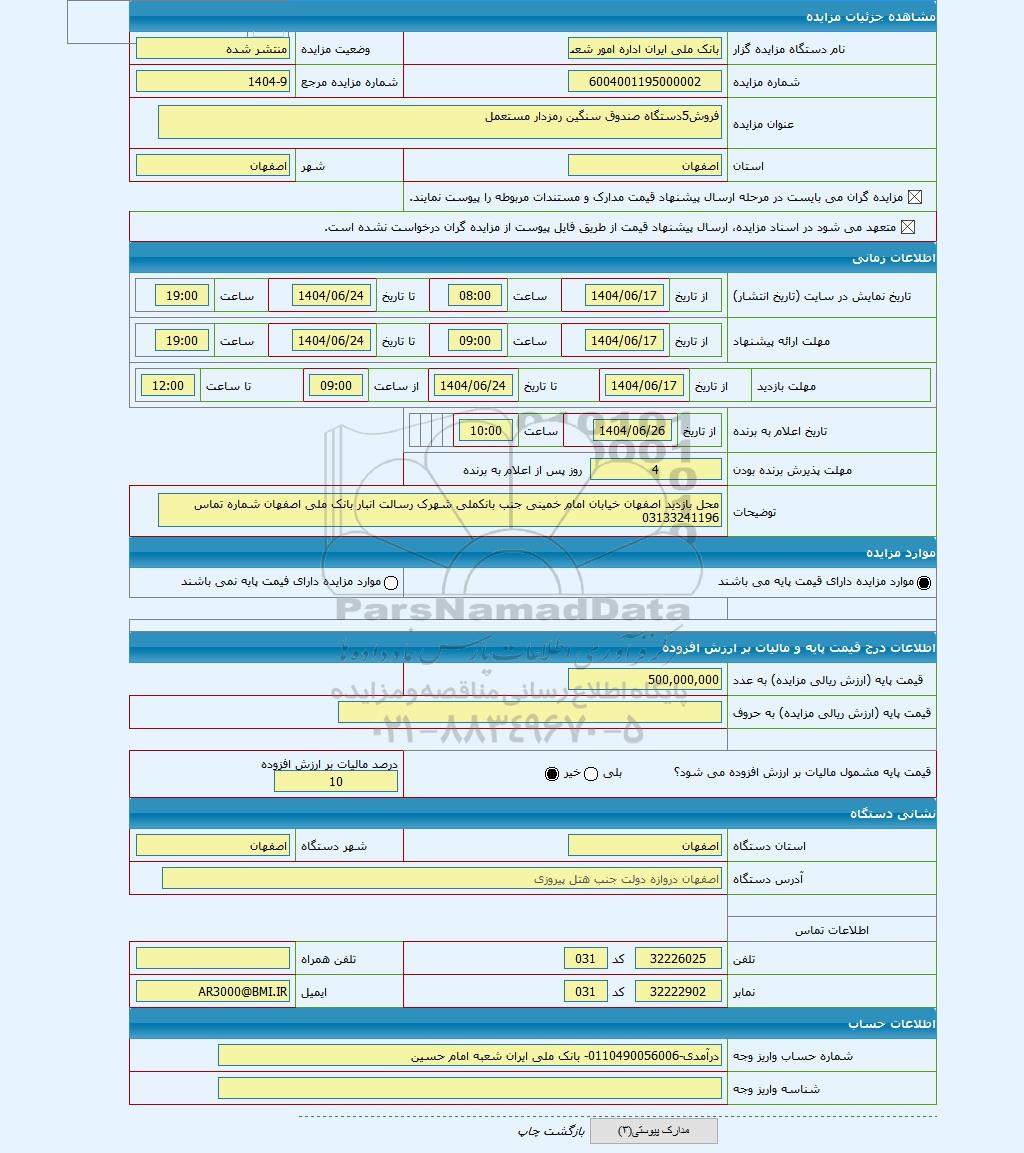 نام دستگاه مزایده گزاربانک ملی ایران اداره امور شعب استان اصفهانوضعیت مزایدهمنتشر شده
