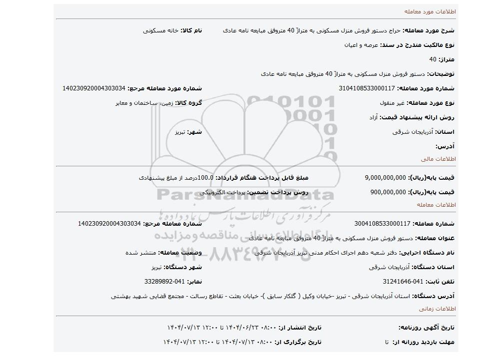 9 مزایده دستور فروش ملک مشاعی 9810687 1404/08/15 new not special not payed آذربایجان شرقی