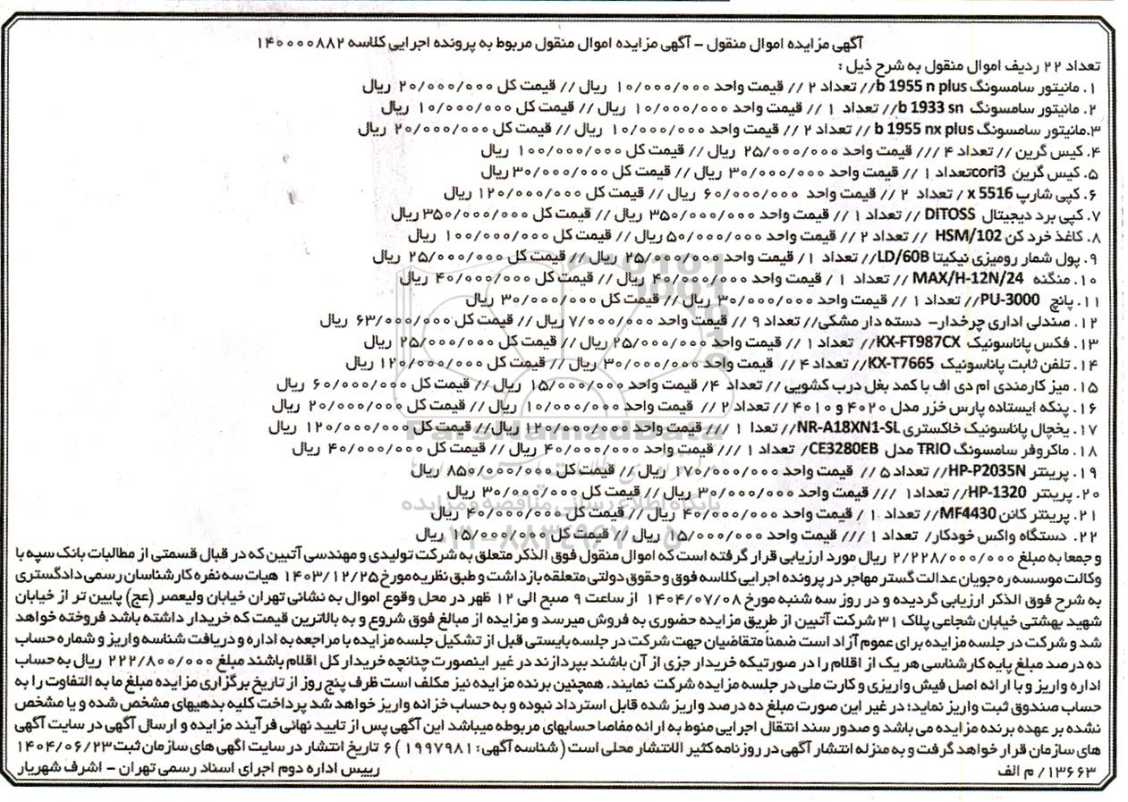 مزایده فروش مانیتور ، کیس ، کپی شارپ ، کپی برد ، پول شمار ، کاغذ خردکن ، منگنه ، پانچ ، صندلی اداری چرخدار ، فکس ، تلفن ثابت ، میز کارمندی ، پنکه ایستاده ، یخچال ، ماکروفر ، پرینتر ، دستگاه واکس خودکار جمعا به مبلغ 2.228.000.000 ریال