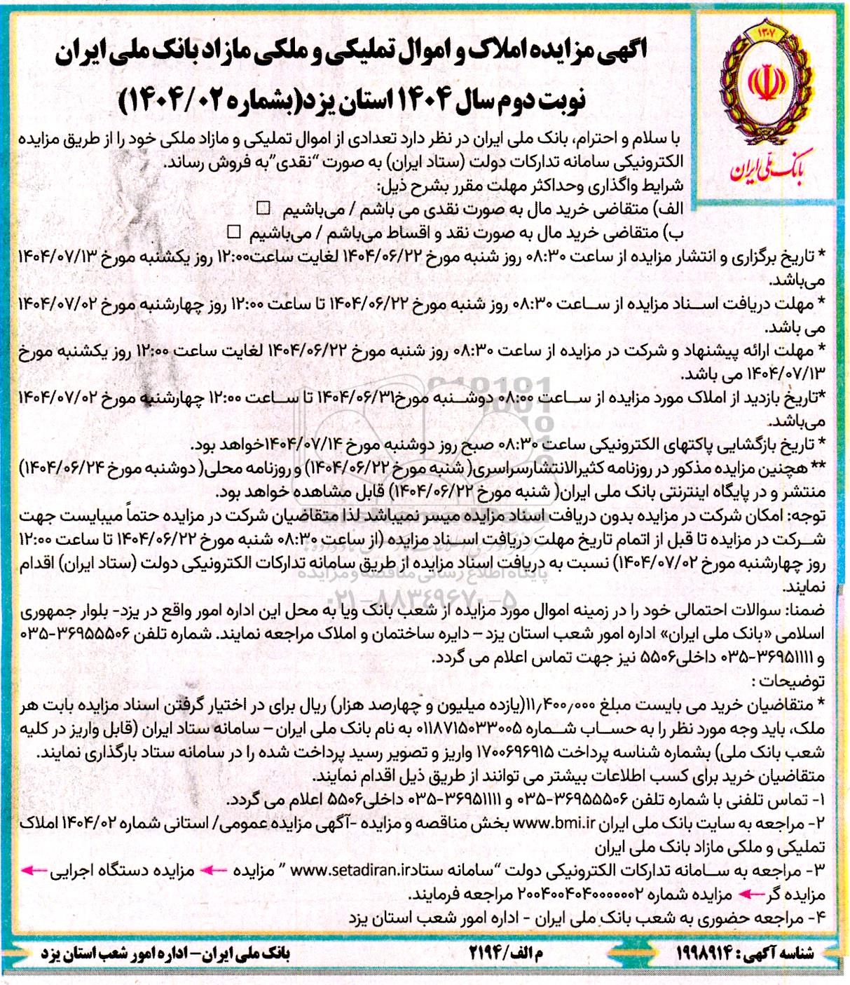 اگهی مزایده املاک و اموال تملیکی و ملکی مازاد بانک ملی ایران نوبت دوم سال 1404 استان یزد بشماره 1404.02)