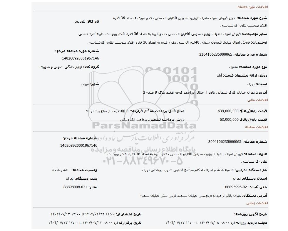 عنوان معامله: فروش اموال منقول تلویزیون سونی 40اینج ال سی دی و غیره به تعداد 36 فقره اقلام بپیوست نظریه کارشناسی