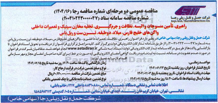 شرکت حمل و نقل ریلی رجا (سهامی خاص) در نظر دارد فراخوان راهبری، نظافت ، تعمیرات داخلی و .... واگن های خلیج فارس، میلاد، دو طبقه، ترن ست، ریل باس به شماره (2004102230000047) را از طریق سامانه تدارکات الکترونیکی دولت برگزار کند. کلیه مراحل برگزاری فراخوان از دریافت و تحویل اسناد فراخوان تا بازگشایی پاکتها از طریق درگاه سامانه تدارکات الکترونیکی دولت (ستاد) به نشانی ستاد ایران انجام خواهد شد. متقاضیان شرکت در فراخوان در صورت عدم عضویت در سامانه نسبت به ثبت نام و دریافت گواهی امضای الکترونیکی به صورت برخط برای کلیه صاحبان امضای مجاز و مهر سازمانی اقدام لازم را به عمل آورند.