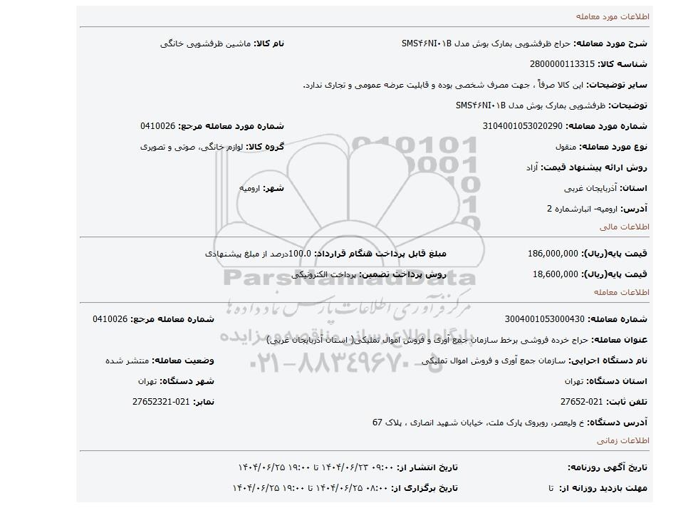 مزایده ظرفشویی بمارک بوش مدل SMS۴۶NI۰۱B, مزایده، ظرفشویی بمارک بوش مدل SMS۴۶NI۰۱B