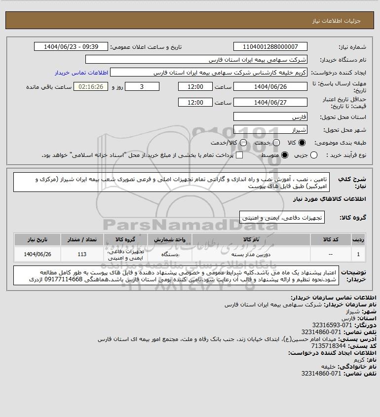 شرح کلی نیاز: تامین ، نصب ، آموزش نصب و راه اندازی و گارانتی تمام تجهیزات اصلی و فرعی تصویری شعب بیمه ایران شیراز (مرکزی و امیرکبیر) طبق فایل های پیوست