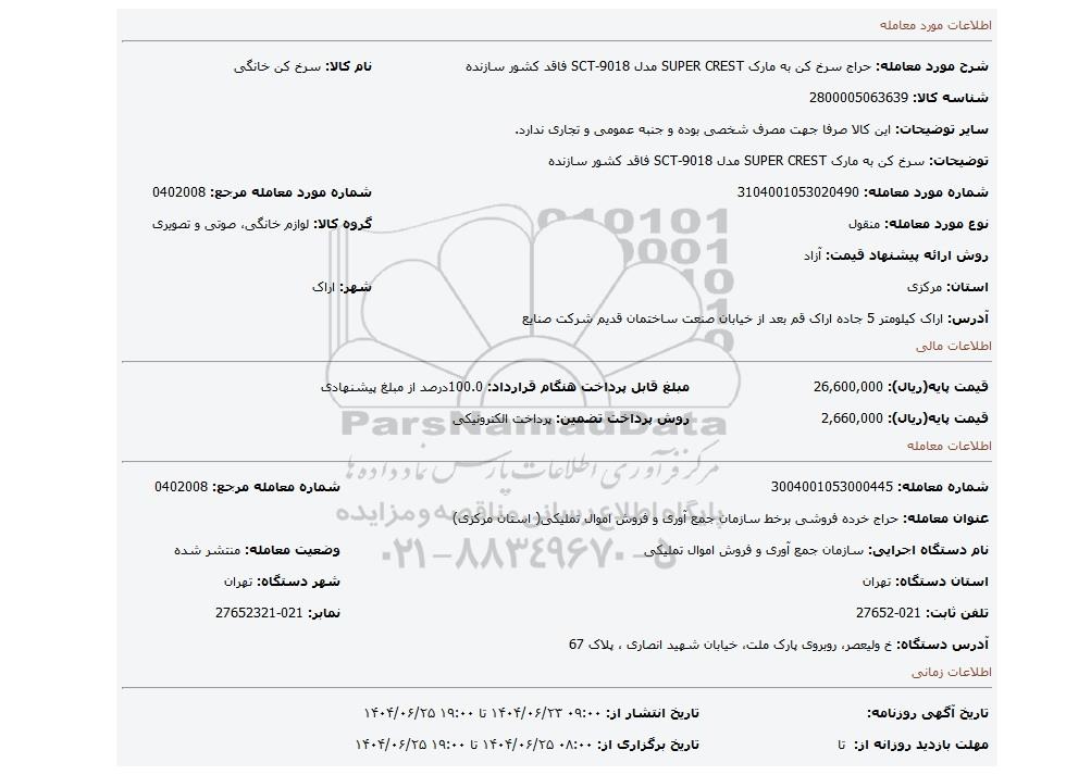 | شرح مورد معامله: حراج سرخ کن به مارک SUPER CREST مدل SCT-9018 فاقد کشور سازنده | نام کالا: سرخ کن خانگی | |