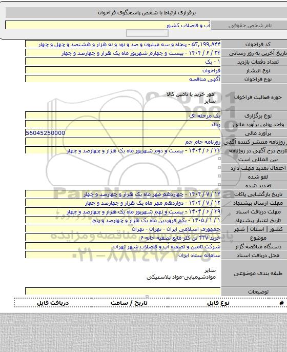 4  آگهی تجدید فراخوان طراحی، ساخت، تهیه و خرید، حمل، نصب، آزمایش و راه‌اندازی، بهره‌ برداری و تضمین عملکرد تصفیه ‌خانه- نوبت دوم 9809711 1404/08/15 new not special not payed تهران