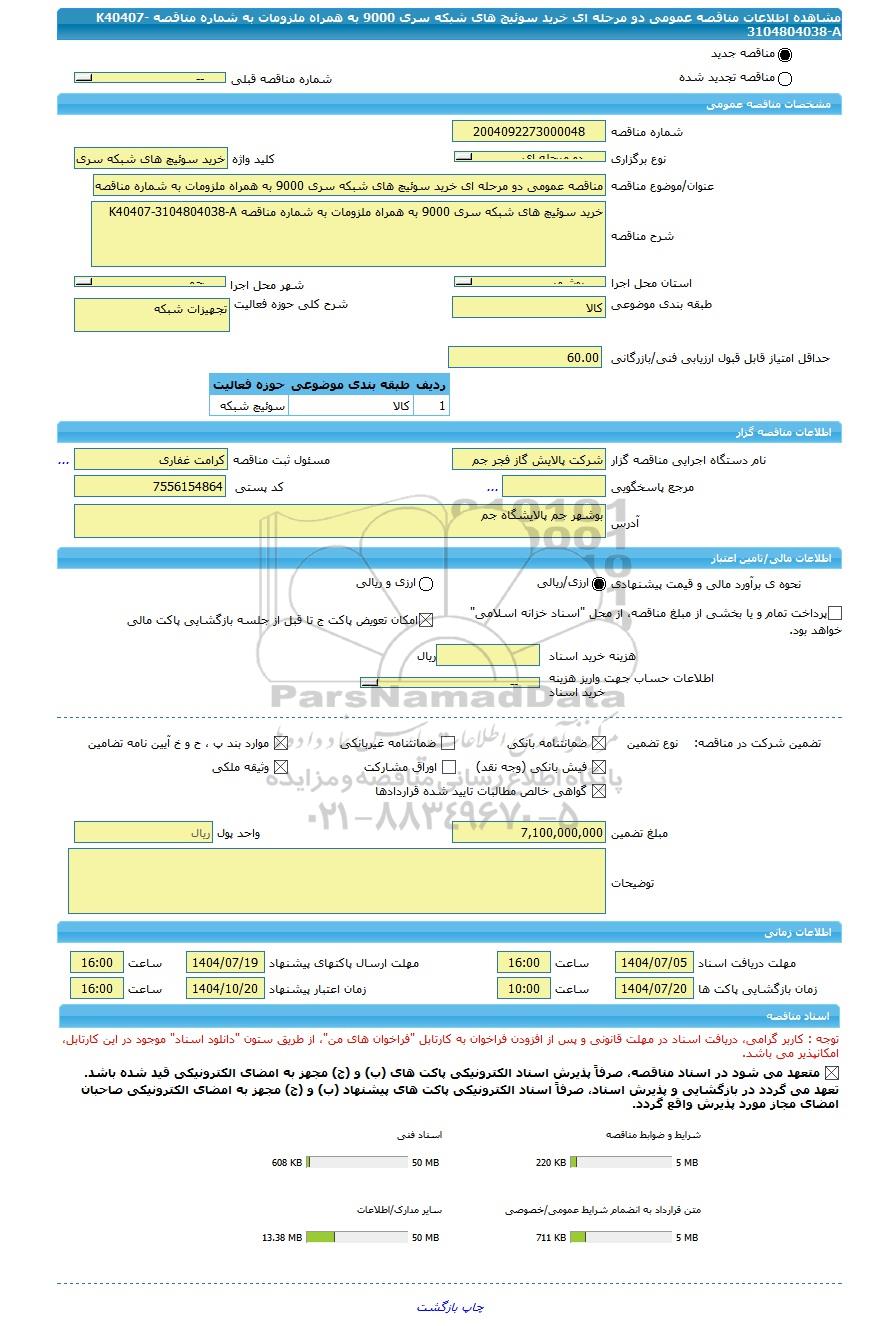 | شرح مناقصه | خرید سوئیچ های شبکه سری 9000 به همراه ملزومات به شماره مناقصه K40407-3104804038-A | ||||||||