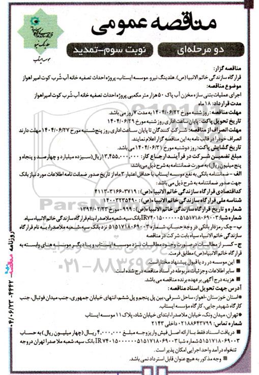 مناقصه گزار :قرارگاه سازندگی خاتم الانبیا (ص) هلدینگ نیرو موسسه ایستاب پروژه احداث تصفیه خانه آب شرب کوت امیر اهواز