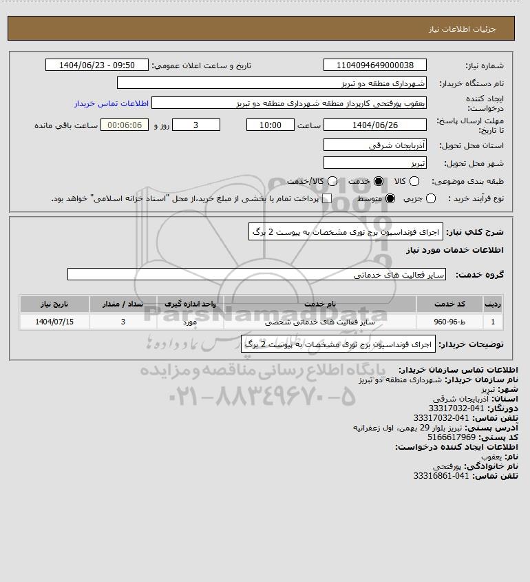 شرح کلی نیاز: اجرای فونداسیون برج نوری مشخصات به پیوست 2 برگ