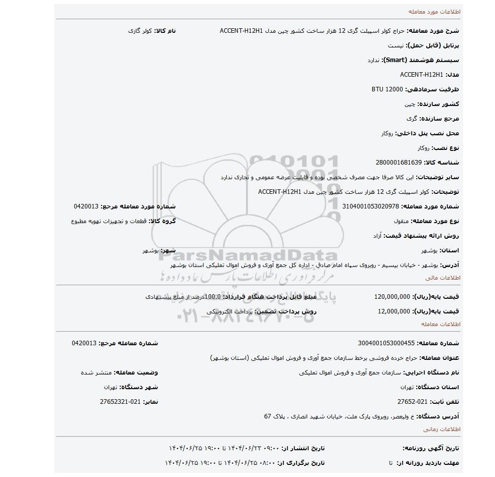 | عنوان معامله: حراج خرده فروشی برخط سازمان جمع آوری و فروش اموال تملیکی (استان بوشهر) | ||