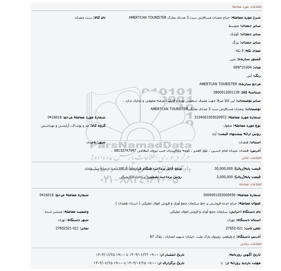 مزایده عمومی مزایده چمدان مسافرتی ست 3 عددی بمارک AMERTCAN TOURISTER برگزار میگردد. از کلیه افراد متخصص و شرکت‌های واجد شرایط دعوت به عمل می‌آید تا در این مزایده با کد خبرگزاری پارس نماد : 9541565 شرکت نمایند تاریخ شروع مزایده : 1404/06/23 مهلت شرکت در مزایده: تا پایان روز 1404/06/25 مکان برگزاری اموال واگذاری استان‌های همدان و دسته‌بندی‌های مربوط به این حراجی متفرقه میباشد.