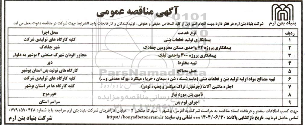 شرکت بنیاد بتن ارم در نظر دارد جهت انجام امور ذیل از کلیه اشخاص حقوقی و حقیقی، تولیدکنندگان و کارخانجات واجد شرایط جهت شرکت در مناقصه دعوت به عمل می آید.