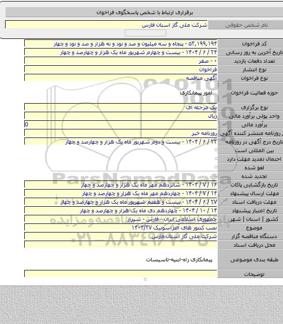 این مناقصه در استان فارس با دسته بندی های صنفی و تخصصی پیمانکاری نفت و گاز و پتروشیمی, کنتور گاز برگزار میشود.