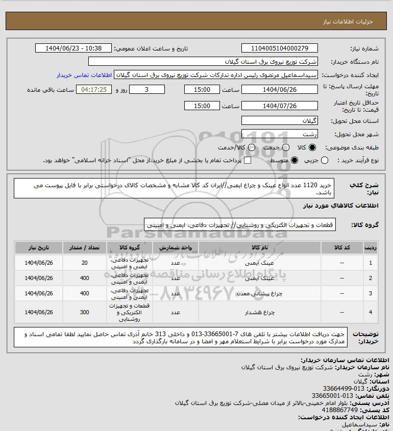 شرح کلی نیاز: خرید 1120 عدد انواع عینک و چراغ ایمنی//ایران کد کالا مشابه و مشخصات کالای درخواستی برابر با فایل پیوست می باشد.