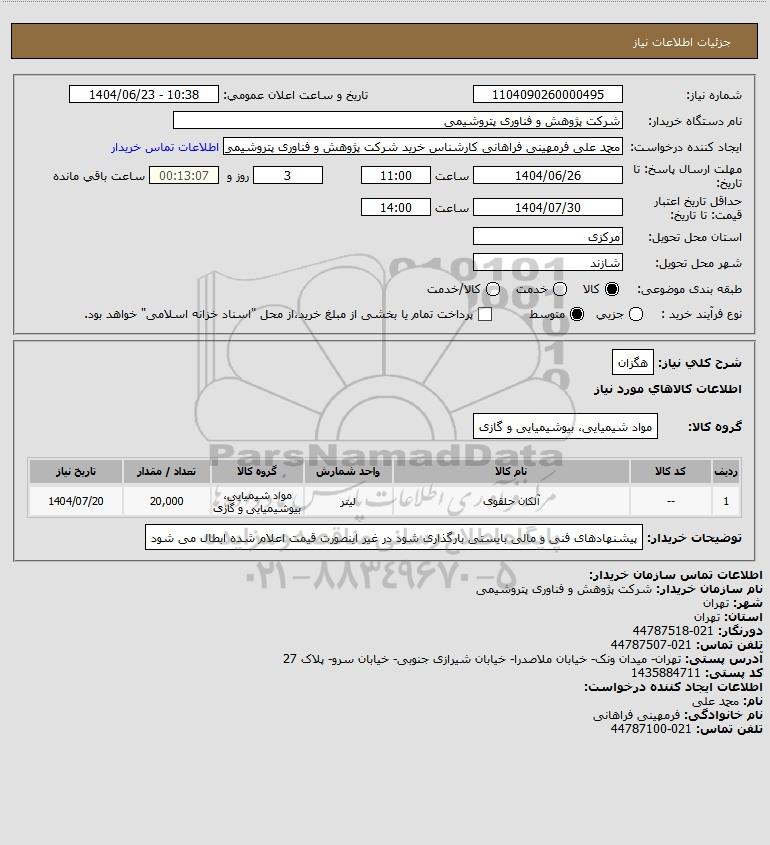 | 1 | -- | آلکان حلقوی | لیتر | مواد شیمیایی، بیوشیمیایی و گازی | 20,000 | 1404/07/20 |
