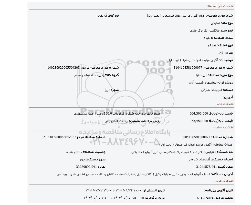 9 مزایده دستور فروش ملک مشاعی 9810687 1404/08/15 new not special not payed آذربایجان شرقی