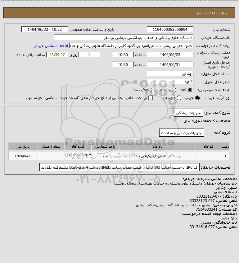 استعلام بها و موضوع استعلام استعلام تجهیزات پزشکی به اطلاع کلیه شرکت‌ها و افراد متخصص واجد شرایط می‌رساند، آگهی گذار در نظر دارد از طریق استعلام بها، نسبت به انتخاب و دریافت پیشنهادات اقدام نماید. این استعلام با کد آگهی ثبت شده در سامانه خبرگزاری پارس نماد : 9541974 منتشر شده است. مشخصات استعلام : تاریخ شروع استعلام: 1404/06/23 آخرین مهلت ارسال پیشنهاد قیمت : 1404/06/25 و محل اجرای پروژه : استان بوشهر میباشد. استعلام قیمت مورد درخواست : استعلام تجهیزات پزشکی با دسته‌بندی‌های تخصصی و گروه های مرتبط : خدمات و تجهیزات آزمایشگاهی و پزشکی, استعلام اطلاع رسانی میگردد.