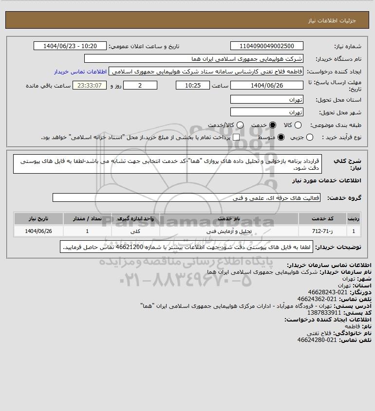 شرح کلی نیاز: قرارداد برنامه بازخوانی و تحلیل داده های پروازی "هما"-کد خدمت انتخابی جهت تشابه می باشد-لطفا به فایل های پیوستی دقت شود.