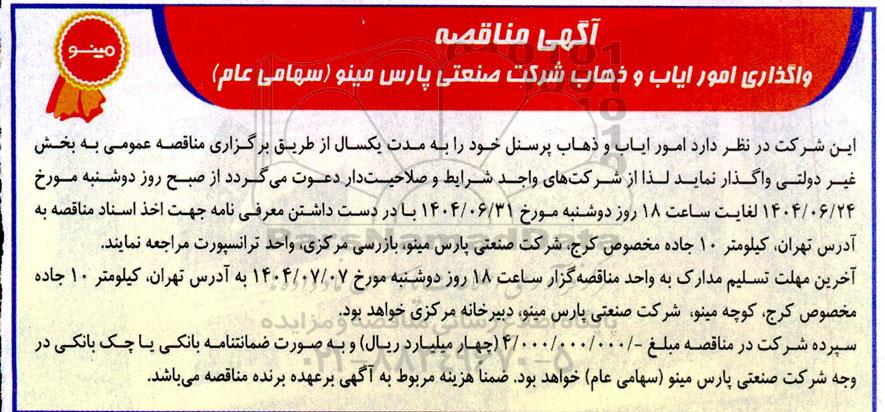 این شرکت در نظر دارد امور ایاب و ذهاب پرسنل خود را به مدت یک سال از طریق برگزاری مناقصه عمومی به بخش غیردولتی واگذار نماید. لذا از شرکت های واجد شرایط و دارای صلاحیت دعوت می گردد از صبح روز دوشنبه مورخ 1404.6.24 لغایت ساعت 18 روز 2شنبه مورخ 1403.06.31 با در دست داشتن معرفی نامه جهت اخذ اسناد مناقصه به آدرس تهران، کیلومتر 10 جاده مخصوص کرج، شرکت صنعتی پارس مینو، بازرسی مرکزی واحد ترانسپورت مراجعه نمایند