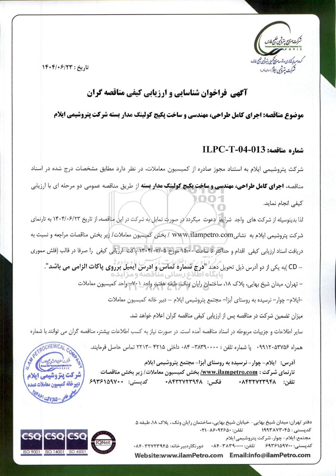 لذا بدینوسیله از شرکت های واجد شرایط دعوت میگردد در صورت تمایل به شرکت در این مناقصه، از تاریخ 1404.06.23 به تارنمای شرکت پتروشیمی ایلام به نشانیwww.ilampetro.com / بخش کمیسیون معاملات/ زیر بخش مناقصات مراجعه و نسبت به دریافت اسناد ارزیابی کیفی اقدام و حداکثر تا ساعت 15:00 مورخ 1404.07.05 پاکت ارزیابی کیفی را صرفا در قالب (فلش مموری – CD )به یکی از دو آدرس ذیل تحویل دهند "درج شماره تماس و ادرس ایمیل برروی پاکات الزامی می باشد".