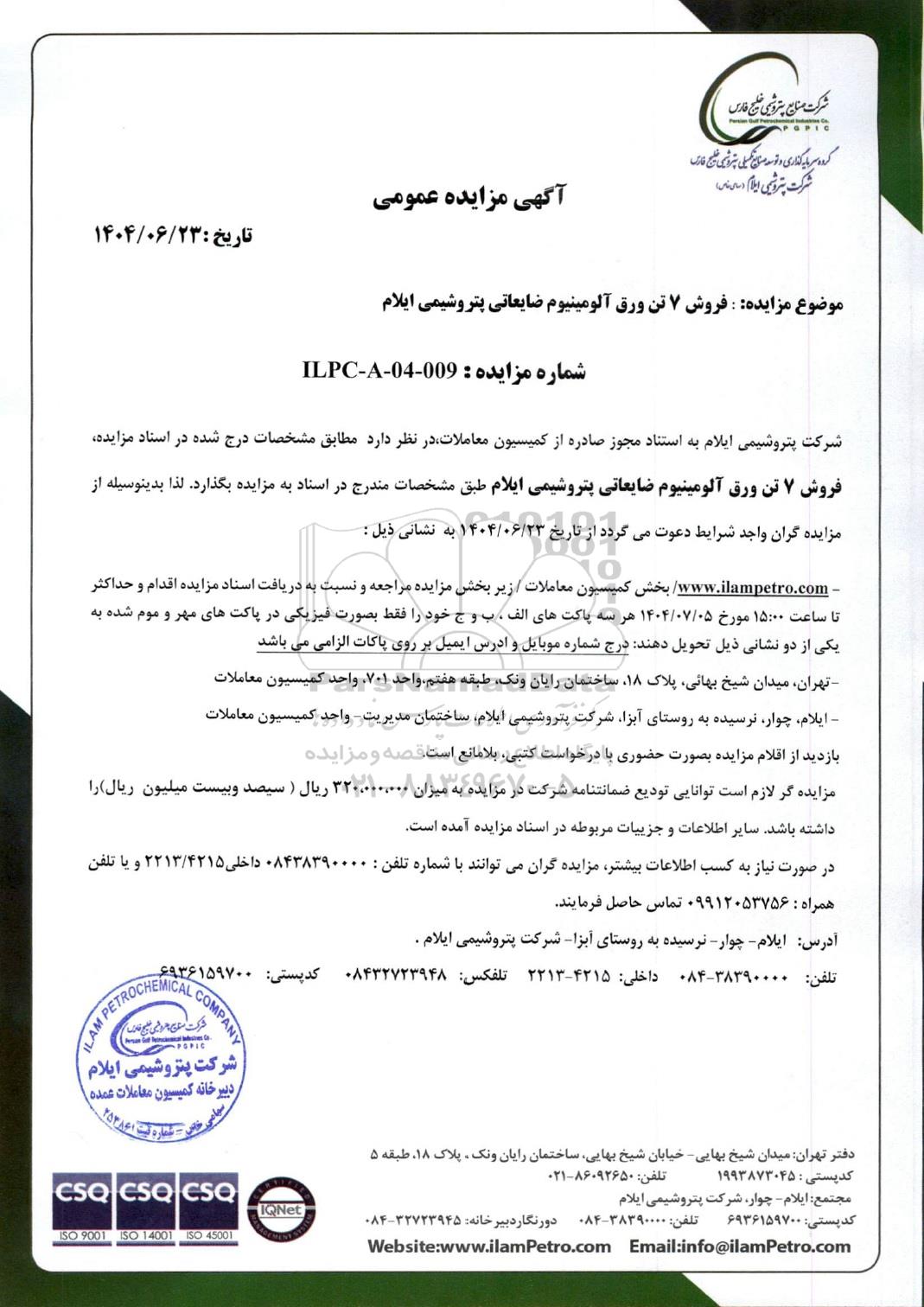 شرکت پتروشیمی ایلام به استناد مجوز صادره از کمیسیون معاملات،در نظر دارد مطابق مشخصات درج شده در اسناد مزایده، فروش 7 تن ورق آلومینیوم ضایعاتی پتروشیمی ایلام طبق مشخصات مندرج در اسناد به مزایده بگذارد. لذا بدینوسیله از مزایده گران واجد شرایط دعوت می گردد از تاریخ 1404.06.23 به نشانی ذیل :