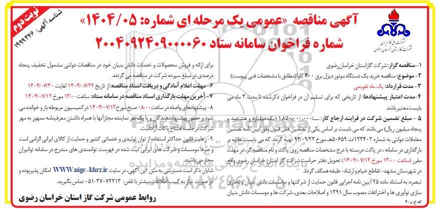 مناقصه خرید یک دستگاه موتور دیزل برق 400 کاوا - نوبت دوم, مناقصه خرید یک دستگاه موتور دیزل برق 400 کاوا - نوبت دوم