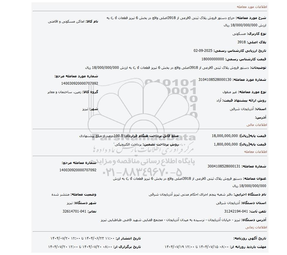| شرح مورد معامله: حراج دستور فروش پلاک ثبتی 0فرعی از 3918اصلی واقع در بخش 6 تبریز قطعات c, d به ارزش 18/000/000/000 ریال | نام کالا: اماکن مسکونی و اقامتی | |