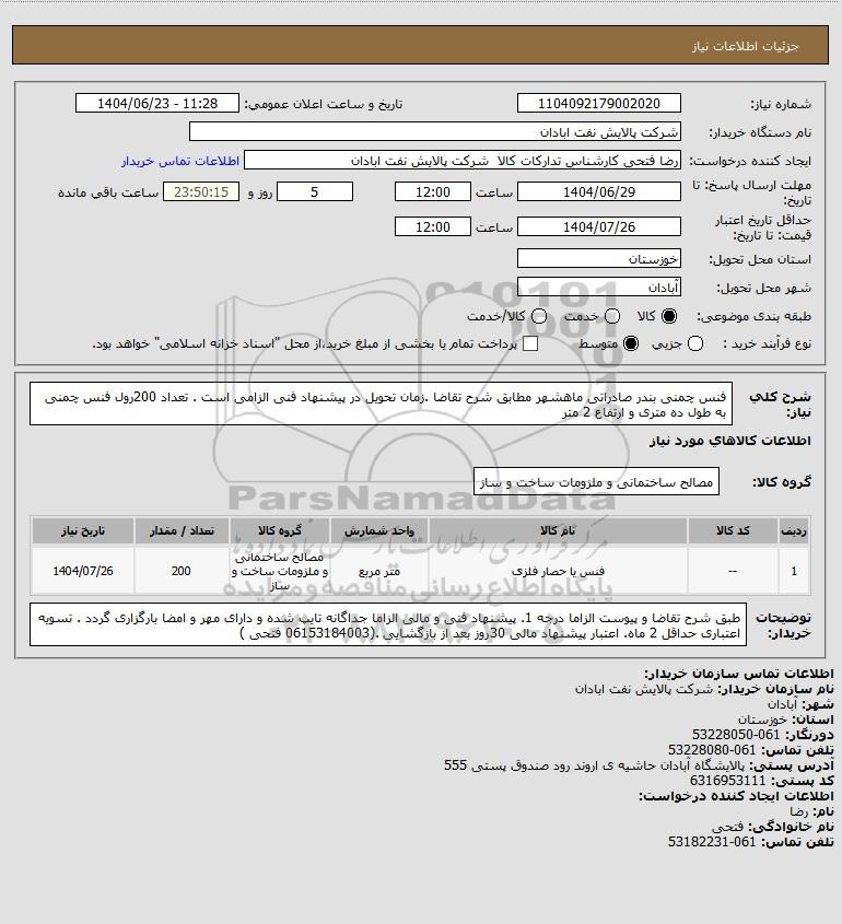 | 1 | -- | فنس یا حصار فلزی | متر مربع | مصالح ساختمانی و ملزومات ساخت و ساز | 200 | 1404/07/26 |