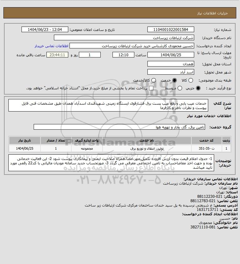 شرح کلی نیاز: خدمات عیب یابی و رفع عیب پست برق فشارقوی ایستگاه زمینی شهیدقندی اسدآباد همدان طبق مشخصات فنی فایل پیوست و نظرات ناظر و کارفرما
