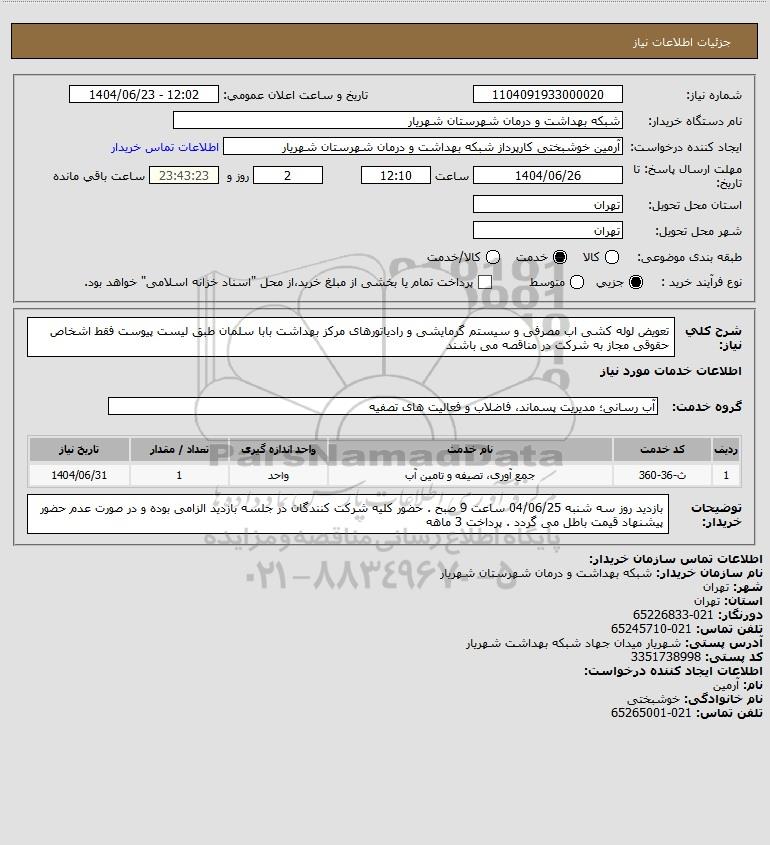 شرح کلی نیاز: تعویض لوله کشی اب مصرفی و سیستم گرمایشی و رادیاتورهای مرکز بهداشت بابا سلمان طبق لیست پیوست فقط اشخاص حقوقی مجاز به شرکت در مناقصه می باشند