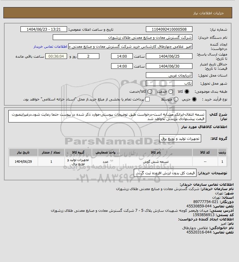 نام دستگاه خریدار:شرکت گسترش معادن و صنایع معدنی طلای زرشوران