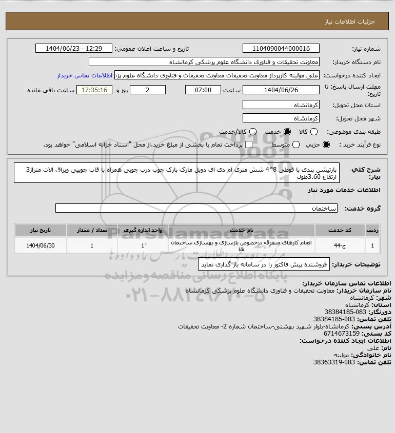 شرح کلی نیاز: پارتیشن بندی با قوطی 8*4 شش متری ام دی اف دوبل مارک پارک چوب درب چوبی همراه با قاب چوبیی ویراق الات متراژ3 ارتفاع 3.60طول