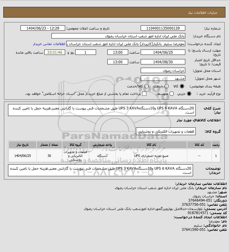 شرح کلی نیاز: 20دستگاه UPS 6 KAVA و10دستگاهUPS 3 KAVA طبق مشخصات فنی پیوست با گارانتی معتبر.هزینه حمل با تامین کننده است.