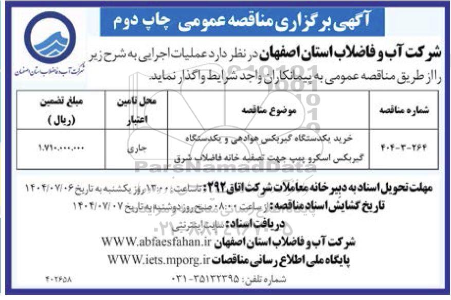 شرکت آب و فاضلاب استان اصفهان در نظر دارد عملیات اجرایی به شرح زیر را از طریق مناقصه عمومی به پیمانکاران واجد شرایط واگذار نماید.