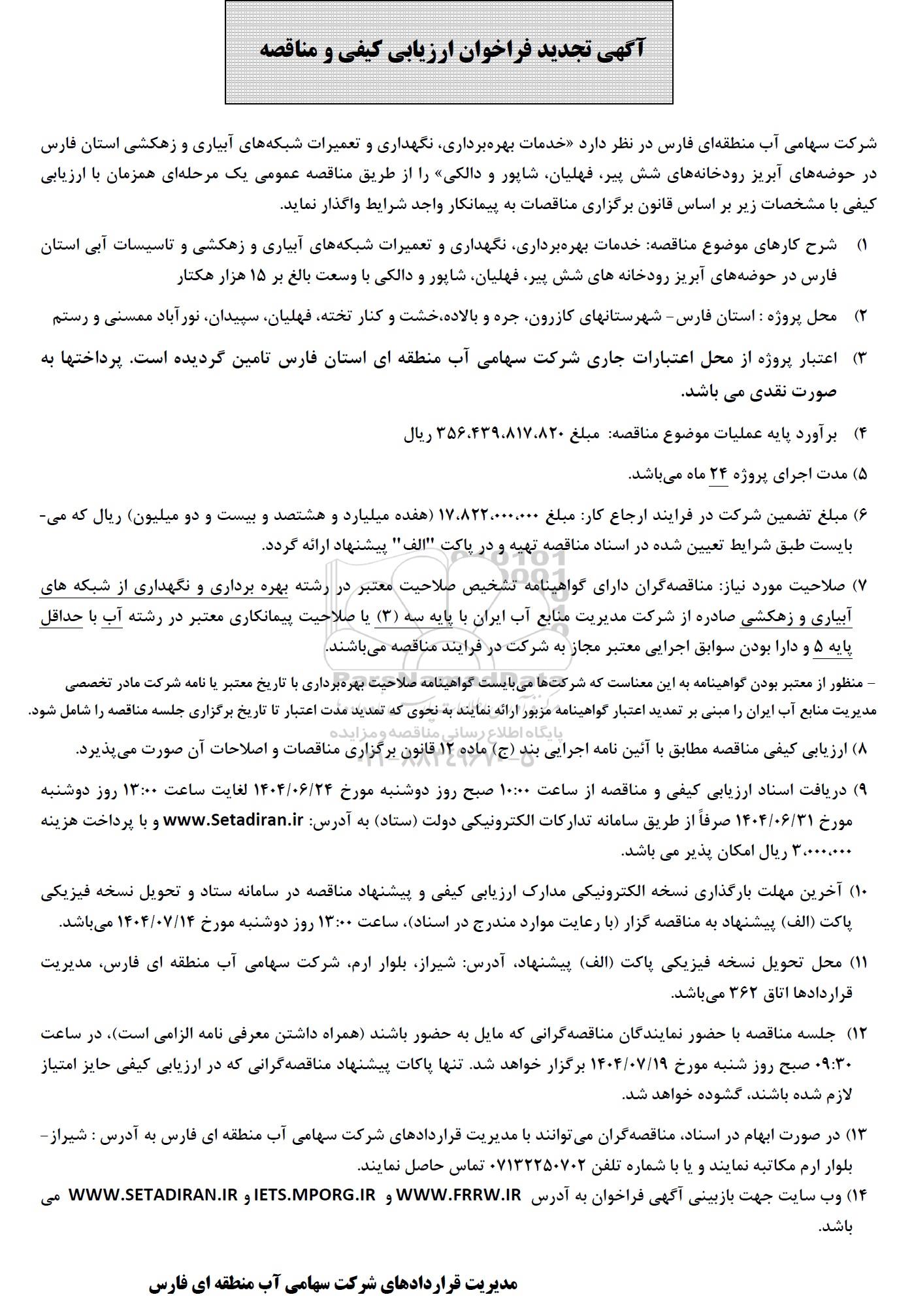 شرکت سهامی آب منطقه ای فارس در نظر دارد خدمات بهره برداری، نگهداری و تعمیرات شبکه های آبیاری و زهکشی استان فارس در حوضه های آبریز رودخانه های شش پیر ،فهلیان، شاپور و دالکی را از طریق مناقصه عمومی یک مرحله ای همزمان با ارزیابی کیفی با مشخصات زیر بر اساس قانون برگزاری مناقصات به پیمانکار واجد شرایط واگذار نماید.