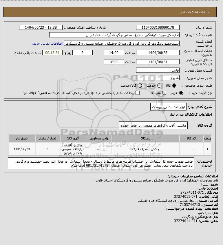 1 استعلام خرید ابزار آلات مرغوب جلوبندی اداره ترابری طبق مشخصات لیست پیوست 9810678 1404/08/15 new not special not payed بوشهر