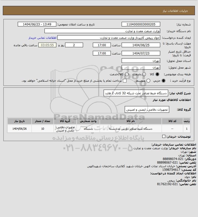 | 1 | -- | دستگاه ضبط تصاویر دوربین مداربسته | دستگاه | تجهیزات دفاعی، ایمنی و امنیتی | 10 | 1404/06/26 |