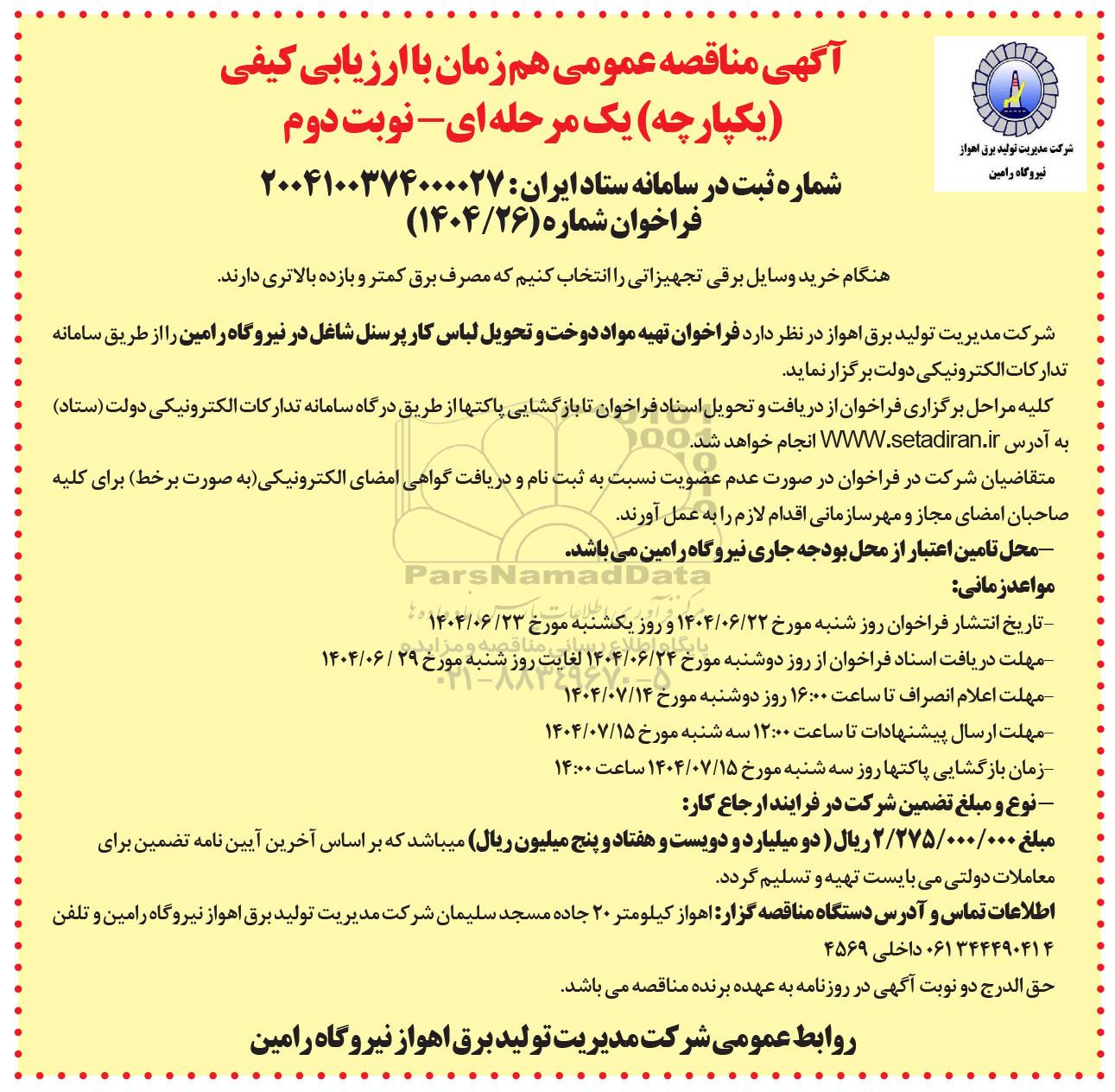 شرکت مدیریت تولید برق اهواز در نظر دارد فراخوان تهیه مواد دوخت و تحویل لباس کار پرسنل شاغل در نیروگاه رامین را از طریق سامانه تدارکات الکترونیکی دولت برگزار نماید.