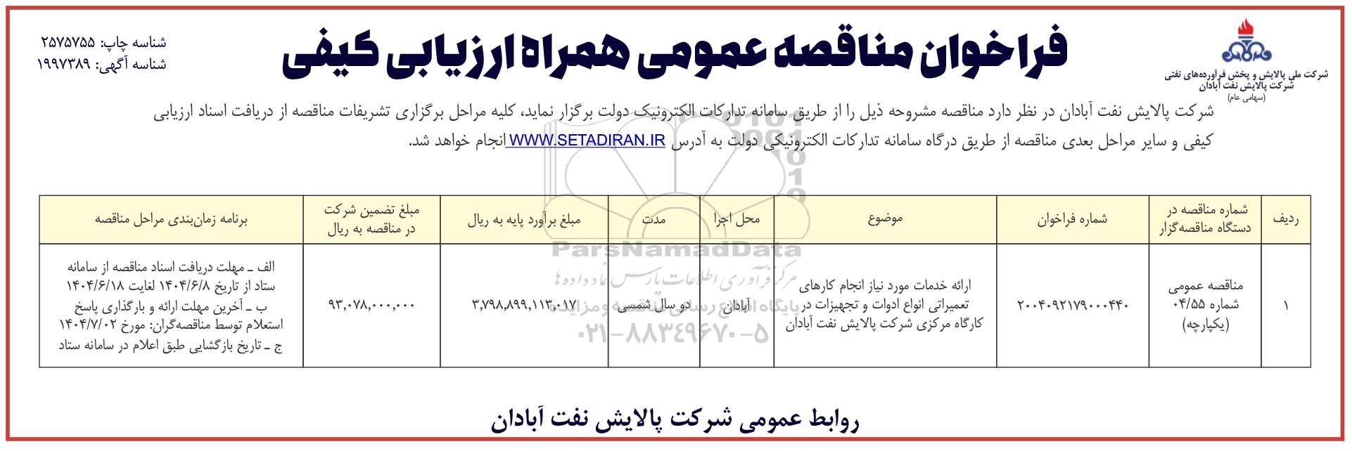 2004092179000440 | ارائه خدمات مورد نیاز انجام کارهای تعمیراتی انواع ادوات و تجهیزات در کارگاه مرکزی شرکت پالایش نفت آبادان | آبادان | دو سال شمسی | 3.798.899.113.017 | 93.078.000.000 |