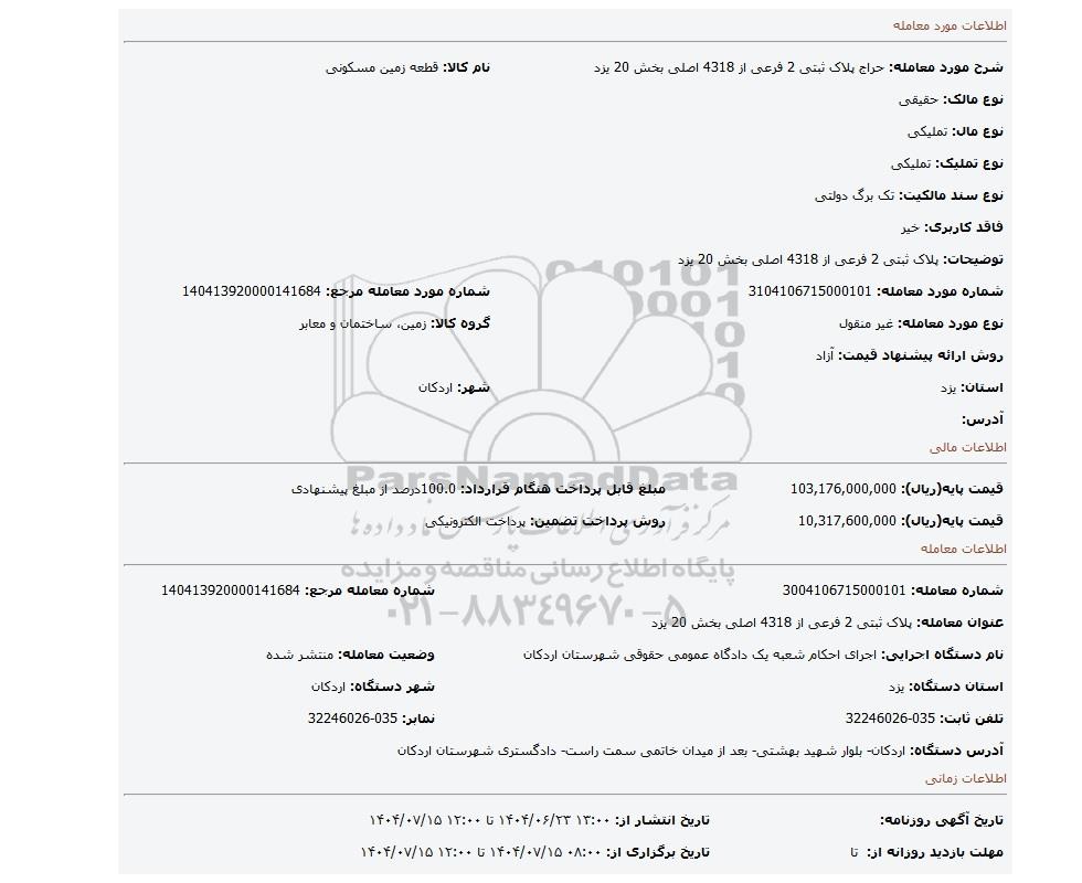 | شرح مورد معامله: حراج پلاک ثبتی 2 فرعی از 4318 اصلی بخش 20 یزد | نام کالا: قطعه زمین مسکونی | |