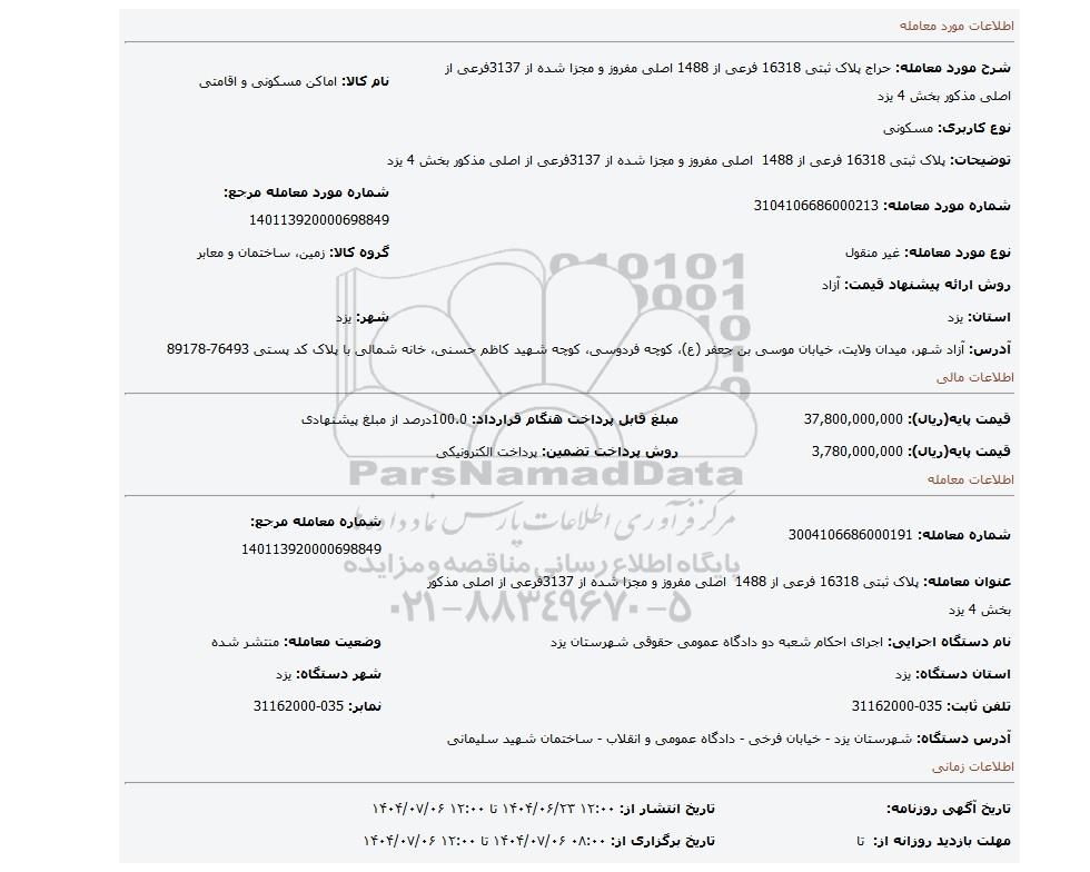 شرح مورد معامله: حراج پلاک ثبتی 16318 فرعی از 1488 اصلی مفروز و مجزا شده از 3137فرعی از اصلی مذکور بخش 4 یزدنام کالا: اماکن مسکونی و اقامتی