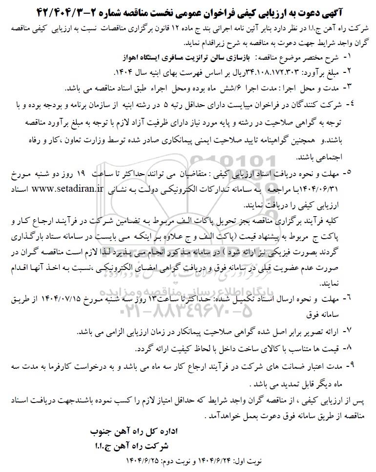 1- شرح مختصر موضوع مناقصه : بازسازی سالن ترانزیت مسافری ایستگاه اهواز