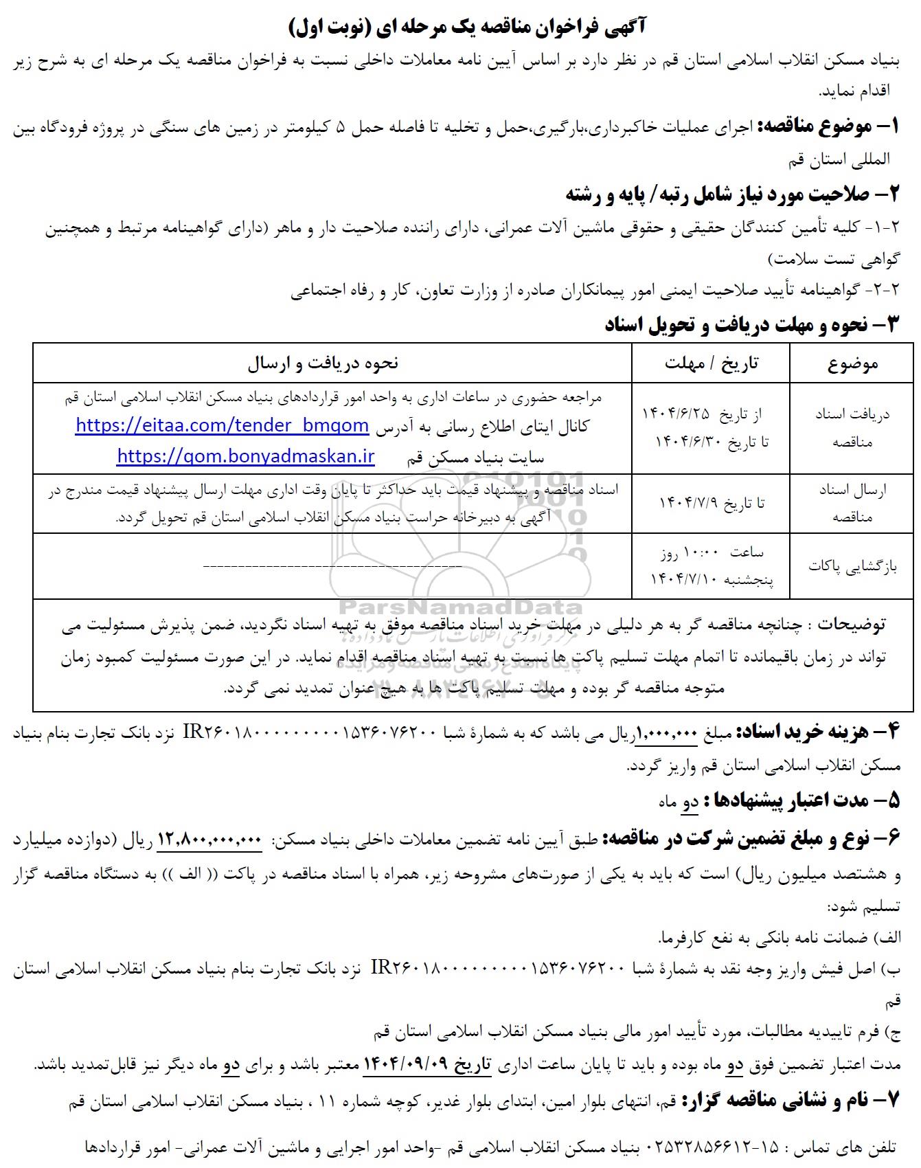 بنیاد مسکن انقلاب اسلامی استان قم در نظر دارد بر اساس آیین نامه معاملات داخلی نسبت به فراخوان مناقصه عمومی یک مرحله ای به شرح زیر اقدام نماید: